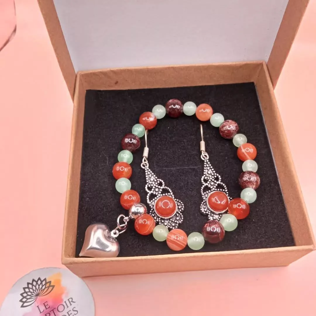 Plongez dans un tourbillon d’énergie avec cette parure artisanale conçue pour celles qui osent. Mariant la vitalité de la Cornaline, la chance de l’Aventurine verte et la force du Grenat, cet ensemble est une véritable invitation à embrasser vos projets avec audace.